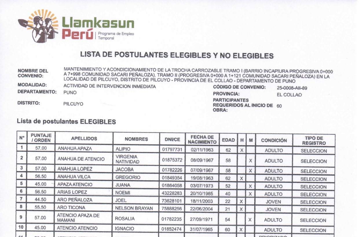 LISTA DE POSTULANTES ELEGIBLES Y NO ELEGIBLES DEL PROGRAMA LLAMKASUN PERU