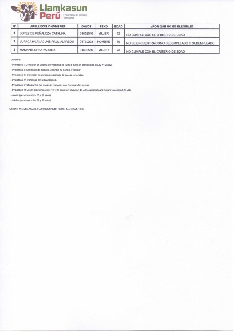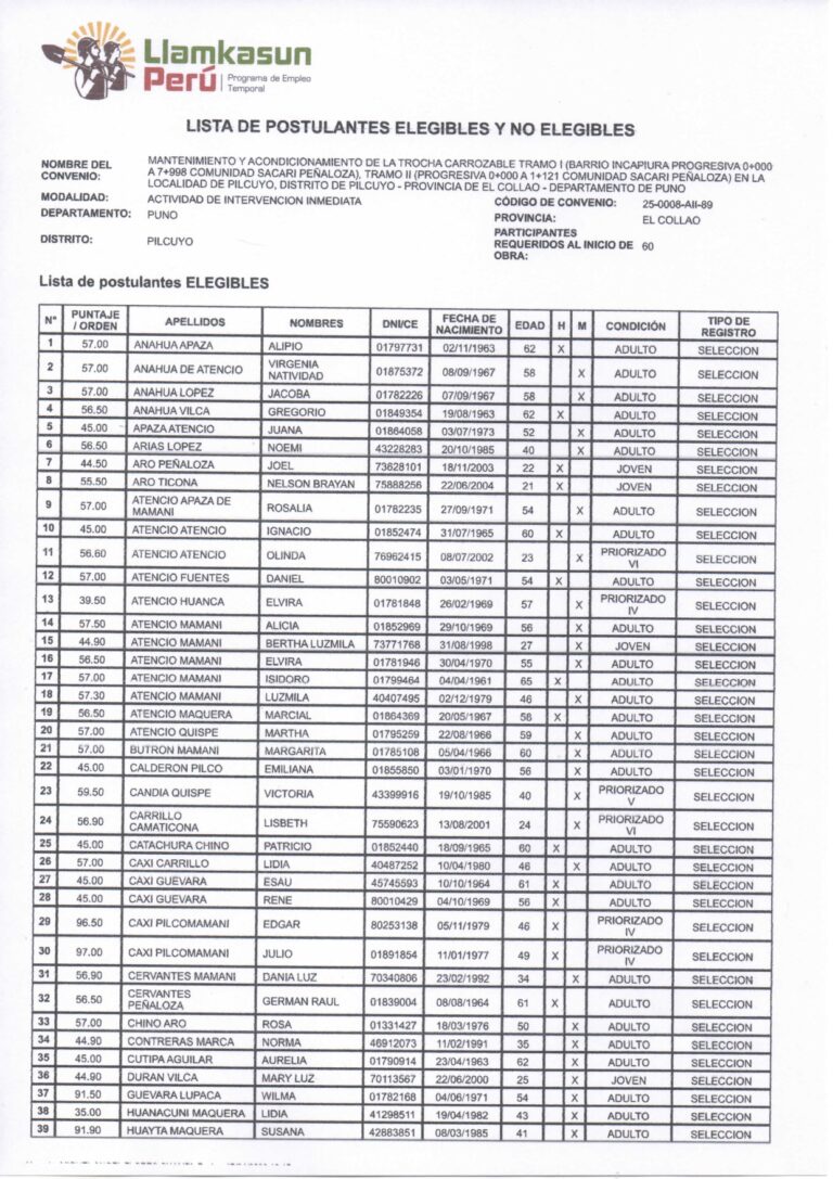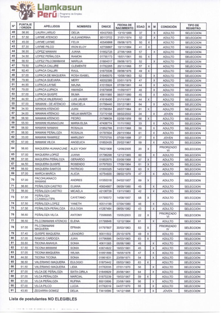 LISTA DE POSTULANTES ELEGIBLES Y NO ELEGIBLES DEL PROGRAMA LLAMKASUN PERU